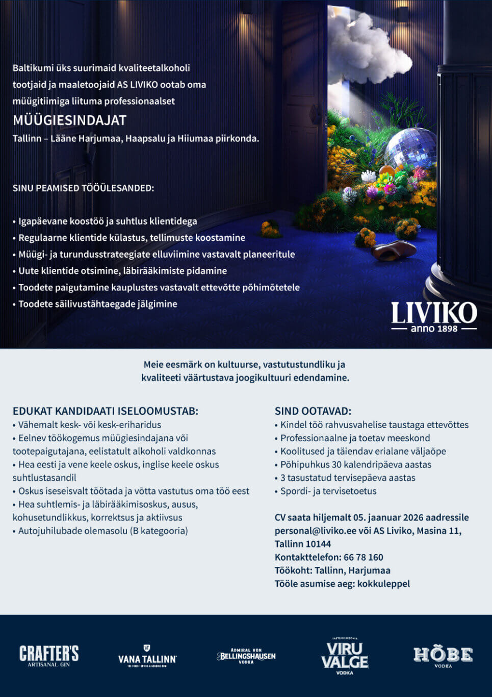 Baltikumi üks suurimaid kvaliteetalkoholi tootjaid ja maaletoojaid AS LIVIKO ootab oma müügitiimiga liituma professionaalset MÜÜGIESINDAJAT Tallinn – Lääne Harjumaa, Haapsalu ja Hiiumaa piirkonda.