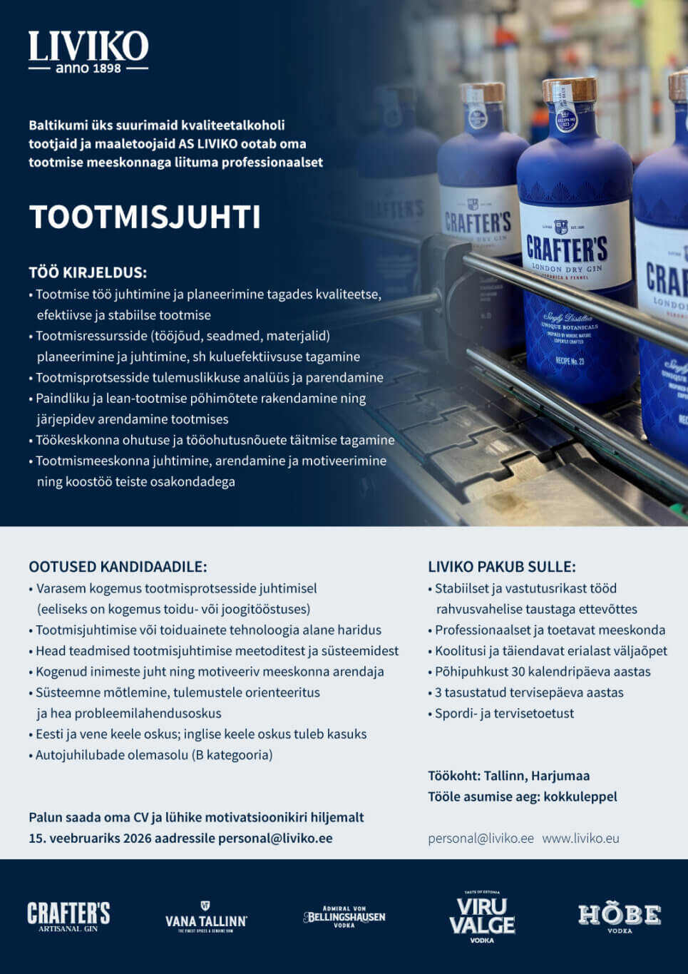 Palun saada oma CV ja lühike motivatsioonikiri hiljemalt 15. veebruariks 2026 aadressile personal@liviko.ee